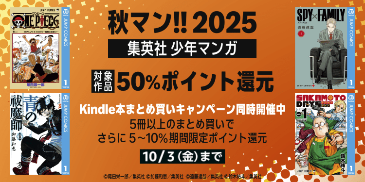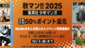 ほかにも『スパイファミリー』『チェンソーマン』『ダンダダン』といった少年ジャンプ+の作品や、『ワールドトリガー』『青の祓魔師』といったジャンプスクエアの作品などもセール開始時点(10月3日発売の新刊は対象外)での既刊全巻が50%ポイント還元になっている。