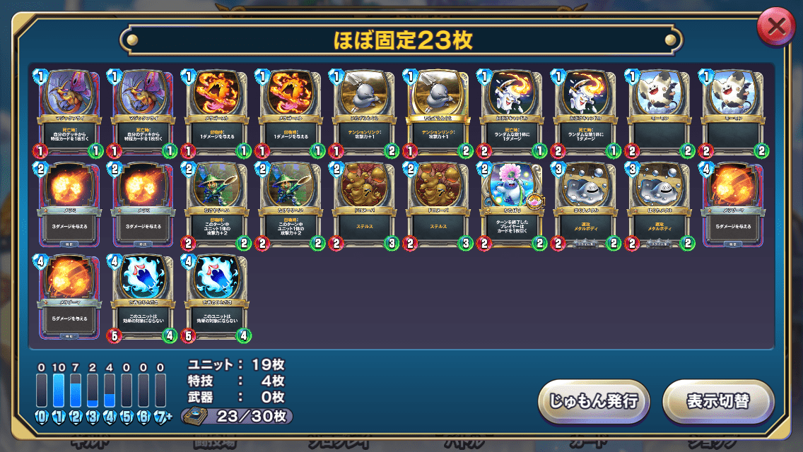 アグロゼシカ同様、最低限必要なレジェンドカードは「わたぼう」くらいで、作成コストが低く、無課金でも作りやすい。さらに作成コストを下げるなら「わたぼう」を抜く手もある。