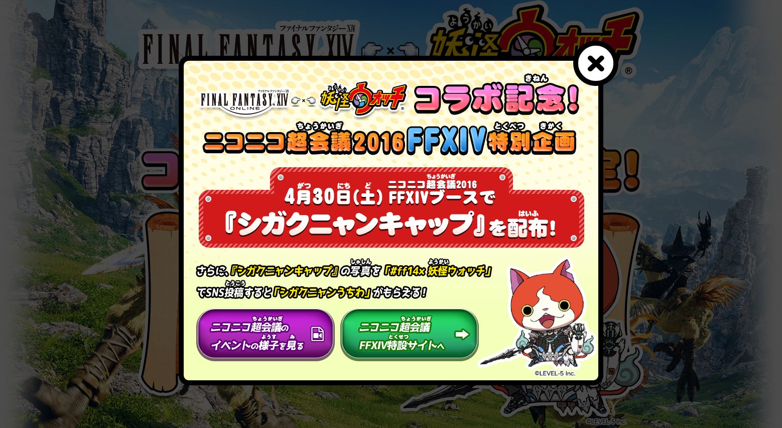 【FF14】妖怪ウォッチコラボの特設サイトが公開!4月30日の超会議では「シガクニャンキャップ」が配布!