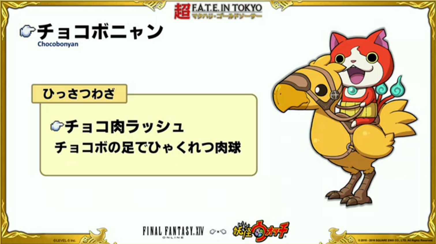 FF14に妖怪ウォッチから各妖怪関連のミニオン、マウント、装備が実装されるように、妖怪ウォッチからはチョコボとモーグリ関連のキャラが実装され...